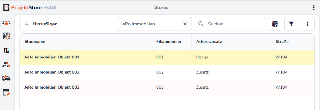 Sobald Sie einen Suchbegriff eingeben, wird die Storeliste automatisch entsprechend gefiltert und zeigt nur noch die passenden Einträge an.
