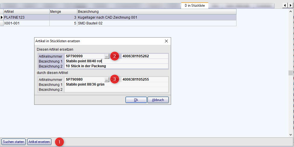 Daraufhin öffnet sich der Dialog „Artikel in Stücklisten ersetzen“.