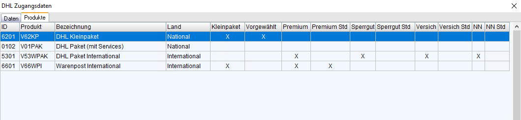 | Produkt | V62KP | Versenden API – „Product“ spalte aus der DHL |