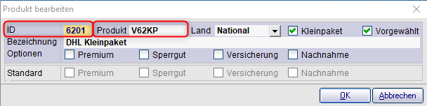 | Optionen | Tragen Sie die Produkt Optionen aus der DHL-Produktionstabelle ein | |