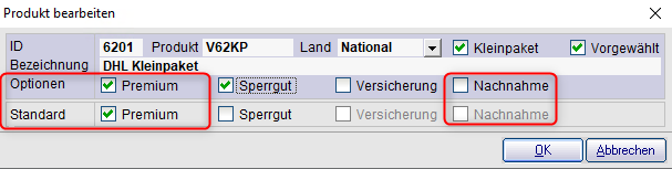 Welche Optionen angekreuzt werden müssen, entnehmen Sie aus der DHL-Produkttabelle.