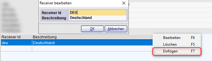 Nachdem Sie Ihre Daten eingetragen haben, führen Sie einen Rechtsklick in das Feld ‚Receiver‘ aus und klicken anschließend auf Einfügen oder alternativ auf F7 (Einfügen).