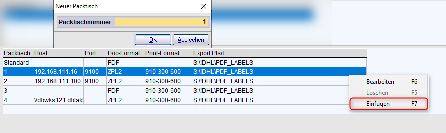 Klicken Sie erneut F7 (Einfügen), um neue Packtische anlegen zu können.