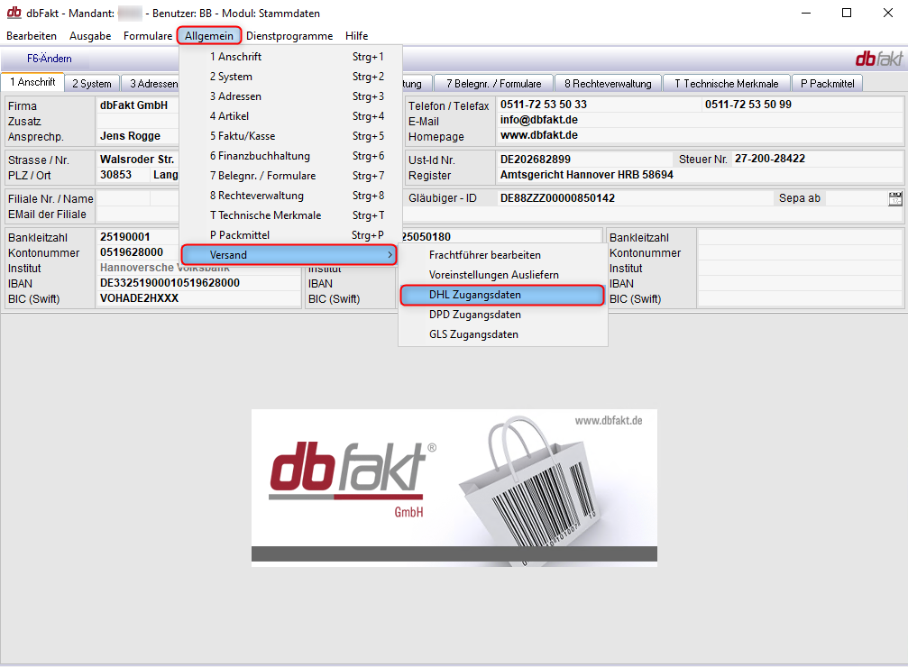 Hiernach können dann über „Stammdaten / Allgemein / Versand / DHL Zugangsdaten“ die nachfolgenden Dialoge ausgefüllt werden.