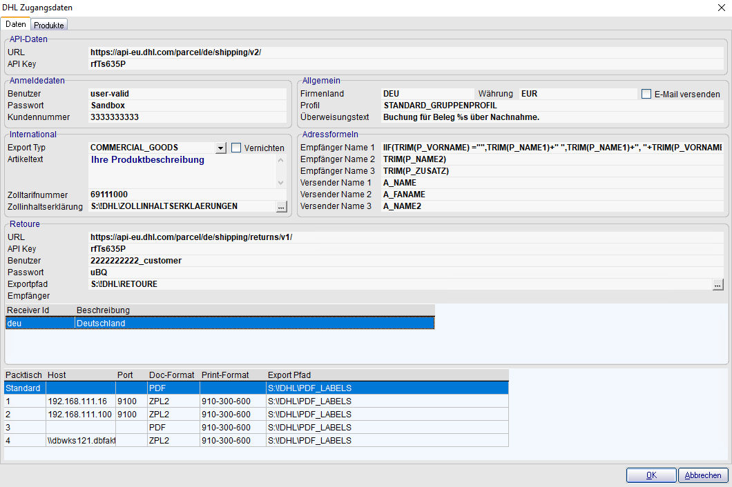 | Pfad | S:\!DHL\PDF_LABELS | Temporärer Speicherpfad für die Dokumente |
